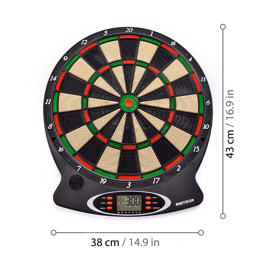 The dartboard has a 38 cm diameter, which is standard for electronic models. Its compact size and wall-mounted design make it suitable even for smaller spaces such as a bedroom, office, or game room.