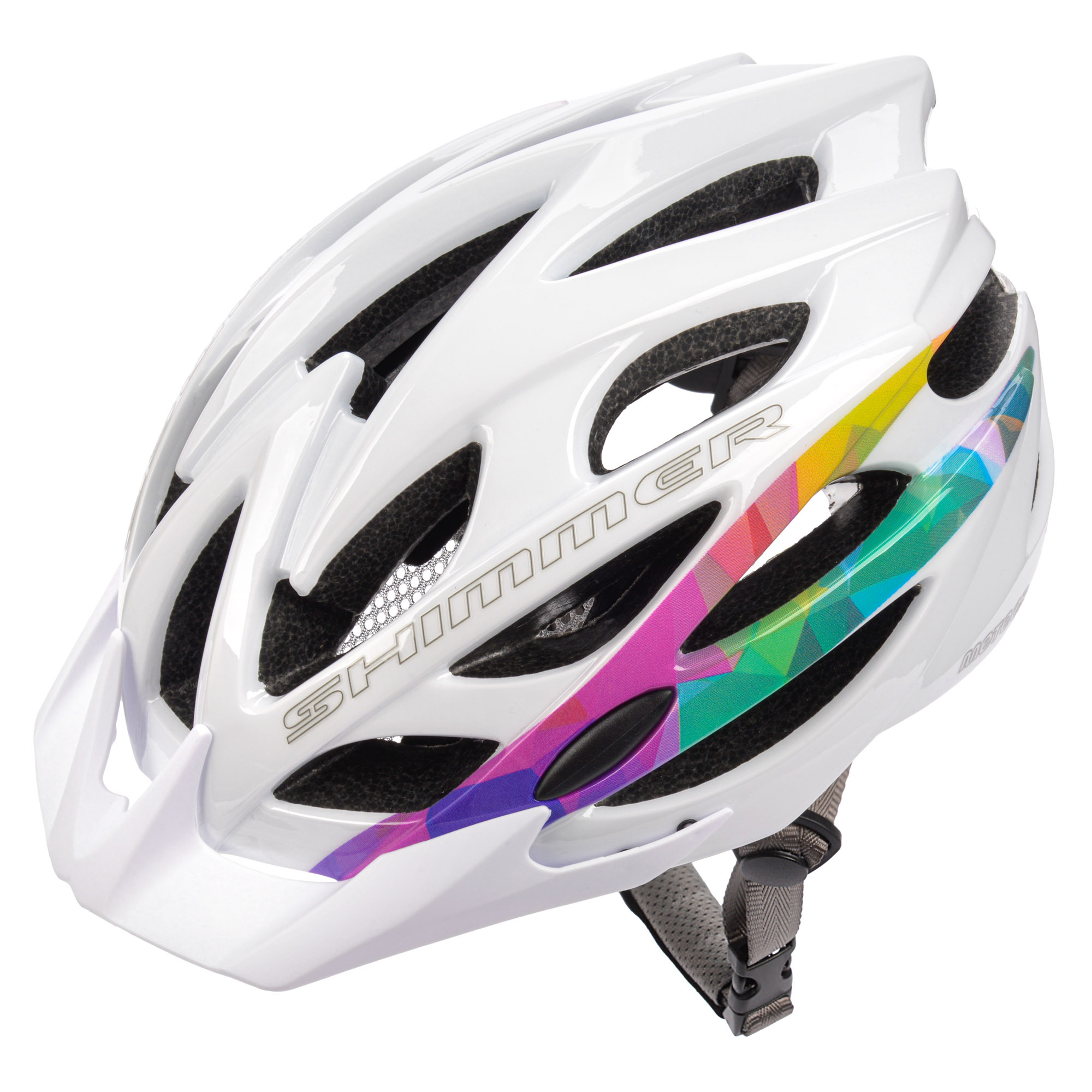 Safety first – the Shimmer helmet provides protection not only against injuries, but also against wind and sunlight thanks to the attachable visor (permanently mounted). The mesh in the ventilation openings shields the head from unpleasant insect bites. The helmet’s reflective elements ensure visibility on the road, increasing both safety and comfort.