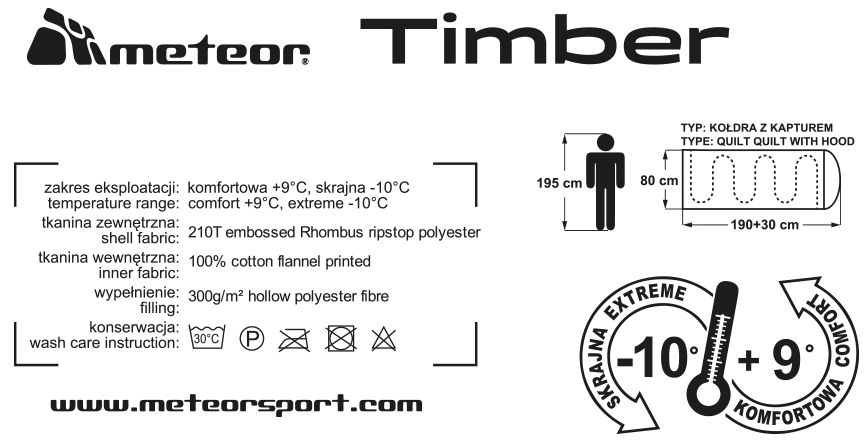 Despite its 190 cm length, this sleeping bag folds down compactly. It fits into a color-matched cover measuring just 37cm x 23cm. The cover features side straps for compression, reducing its size to a mere 27cm. Now you can pack it easily and save space! Choose the METEOR TIMBER sleeping bag for unbeatable performance. Stay warm, cozy, and prepared for any adventure.