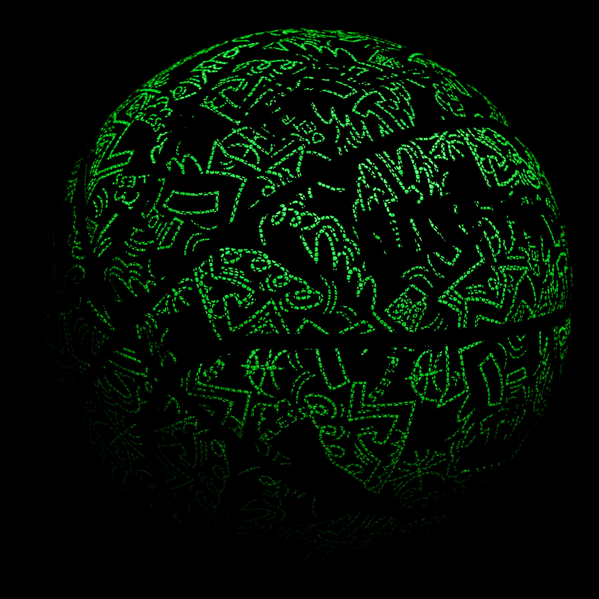 The ball is illuminated by sunlight or another strong light source, absorbs it, and emits it in darkness. Depending on the intensity of light during the day and the time spent in sunlight, the ball glows with varying brightness.