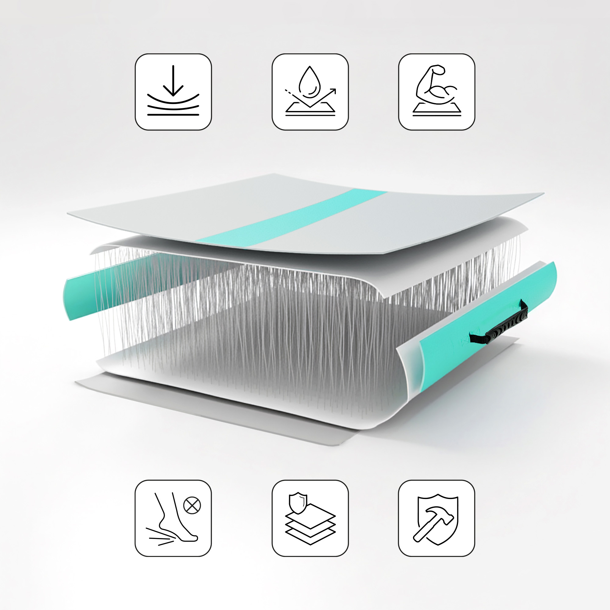 The 10cm thick mat provides high comfort, protecting against direct contact with the ground. It features a sealed valve that effectively prevents air leakage. The drop-stitch reinforced construction (combining PVC fabric and 500D polyester) ensures durability, bounce, and water resistance. Drop-stitch technology uses a special fibre structure connecting the top and bottom of the mat, allowing it to maintain its shape under pressure without damage.
