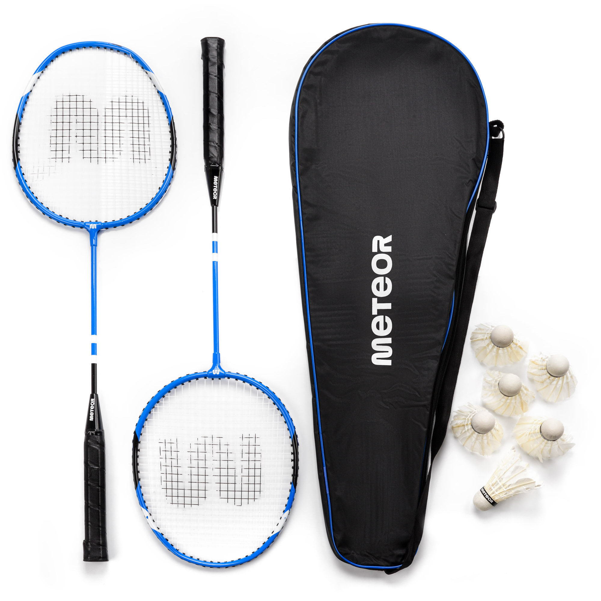 Das Set enthält 2 Alu-Badmintonschläger und 6 Federbälle. Das Set ist in zwei Farbversionen erhältlich - rot und blau. Das gesamte Set ist in einer Schutzhülle mit einem verstellbaren Riemen für den einfachen Transport verpackt.
