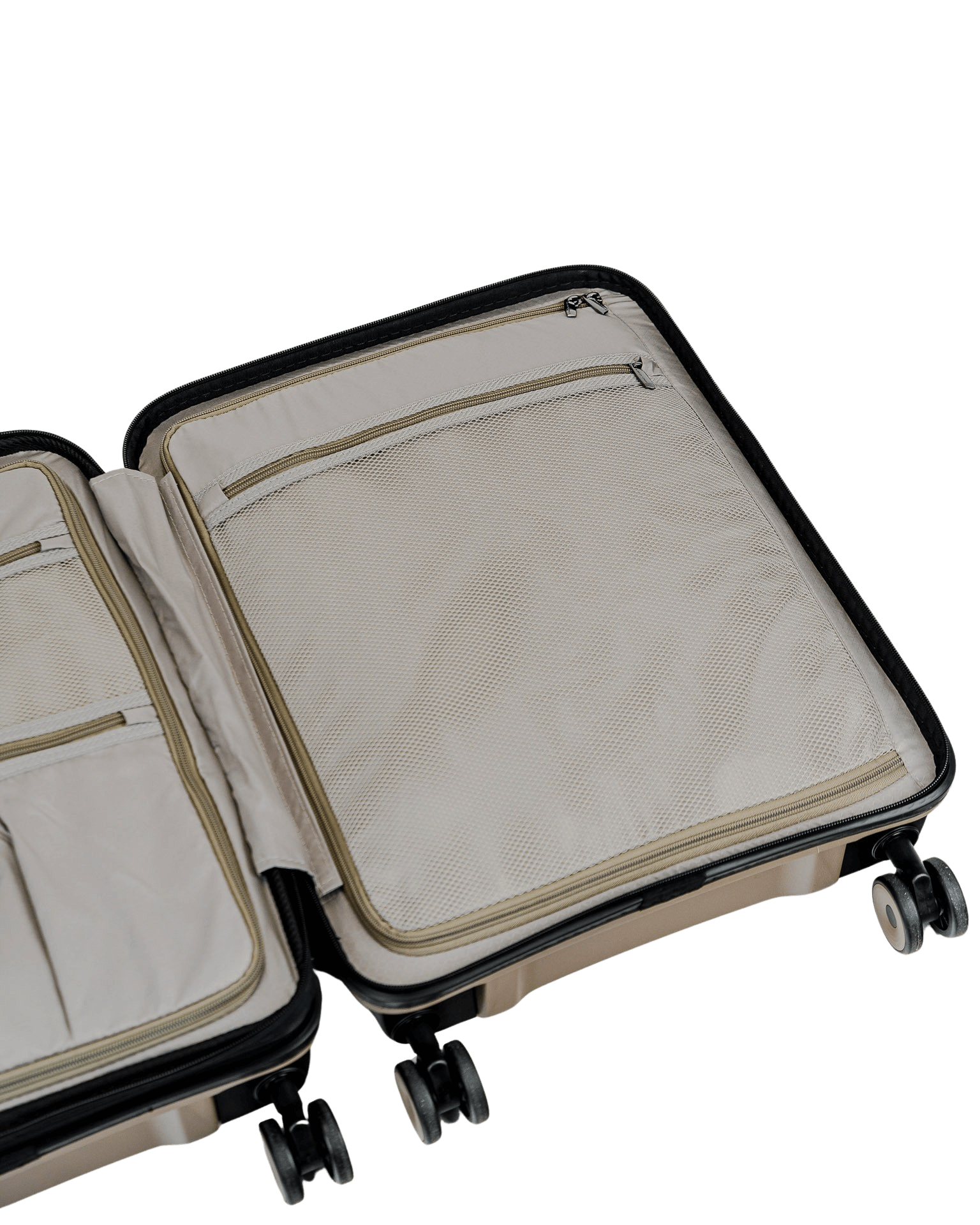 Im Inneren befinden sich zwei gut organisierte Fächer mit Reißverschlusstaschen und elastischen Riemen, um Ihre Sachen an Ort und Stelle zu halten. Die Fächer sind mit einem eleganten Stoff ausgekleidet. Einer der bedeutendsten Vorteile des ECHO-Modells ist seine erweiterbare Kapazität. Sie können das Volumen um ca. 3 cm vergrößern und so mehr Platz für Ihre Gegenstände schaffen.