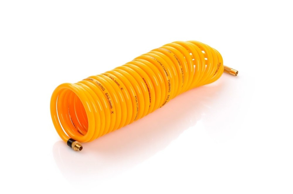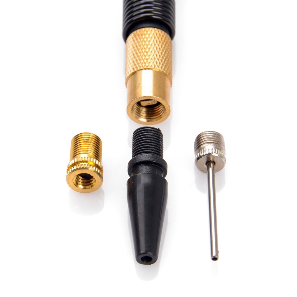 Trzy wymienne końcówki znajdują zastosowanie podczas pompowania różnego sprzętu: mosiężna służy do zaworów opon, plastikowa do materacy i zabawek nadmuchiwanych, a igła do piłek. W zestawie znajduje się pneumatyczny wąż spiralny o wysokiej elastyczności zakończony szybko-złączami. Charakteryzuje się dużą łatwością użytkowania, a jego spiralny kształt minimalizuje ryzyko splątania.