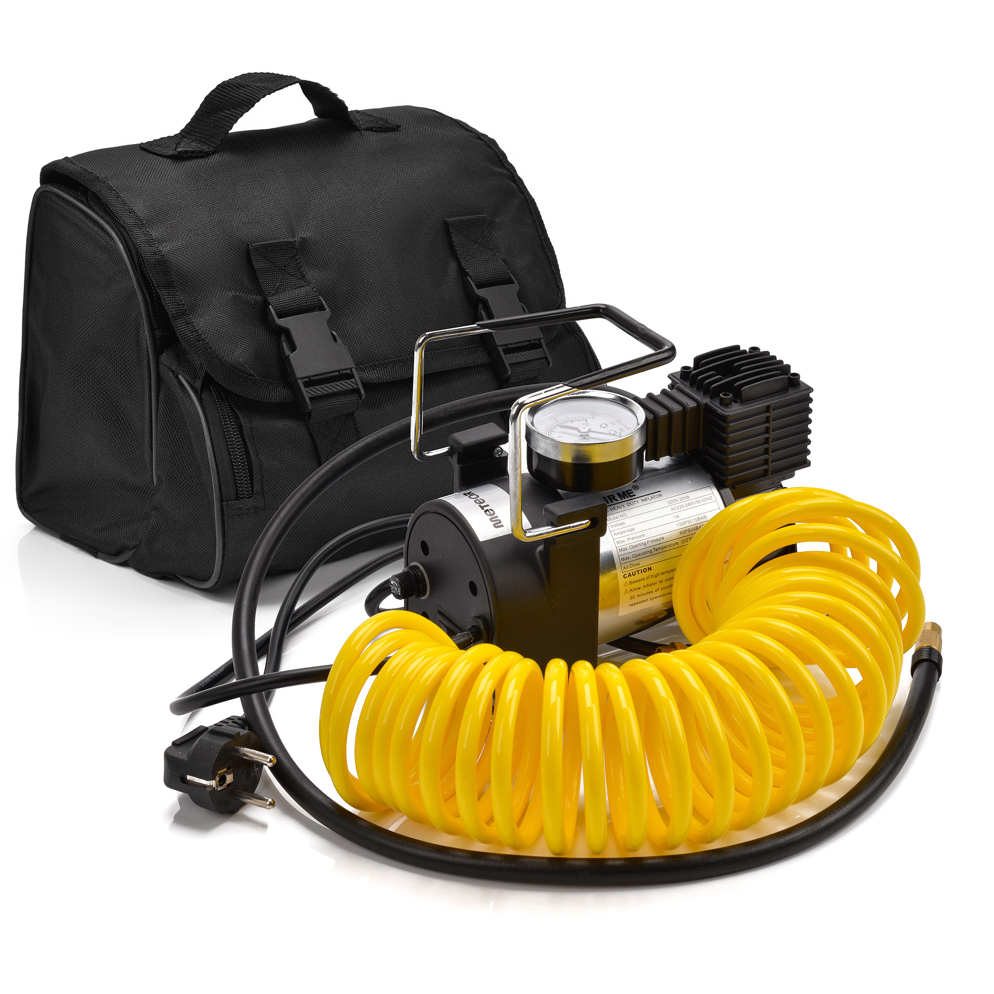 Solidna konstrukcja w metalowej obudowie oferuje odporność na zniszczenie. Kompresor został oparty na gumowych nóżkach, niwelujących drgania podczas jego pracy i zwiększających stabilność. Dzięki specjalnej rączce i niewielkiej wadze kompresor jest łatwy do przenoszenia. Kompaktowe wymiary pozwalają na łatwe przechowywanie urządzenia w bagażniku auta lub garażu. W komplecie znajduje się torba tekstylna do wygodnego transportu kompresora.