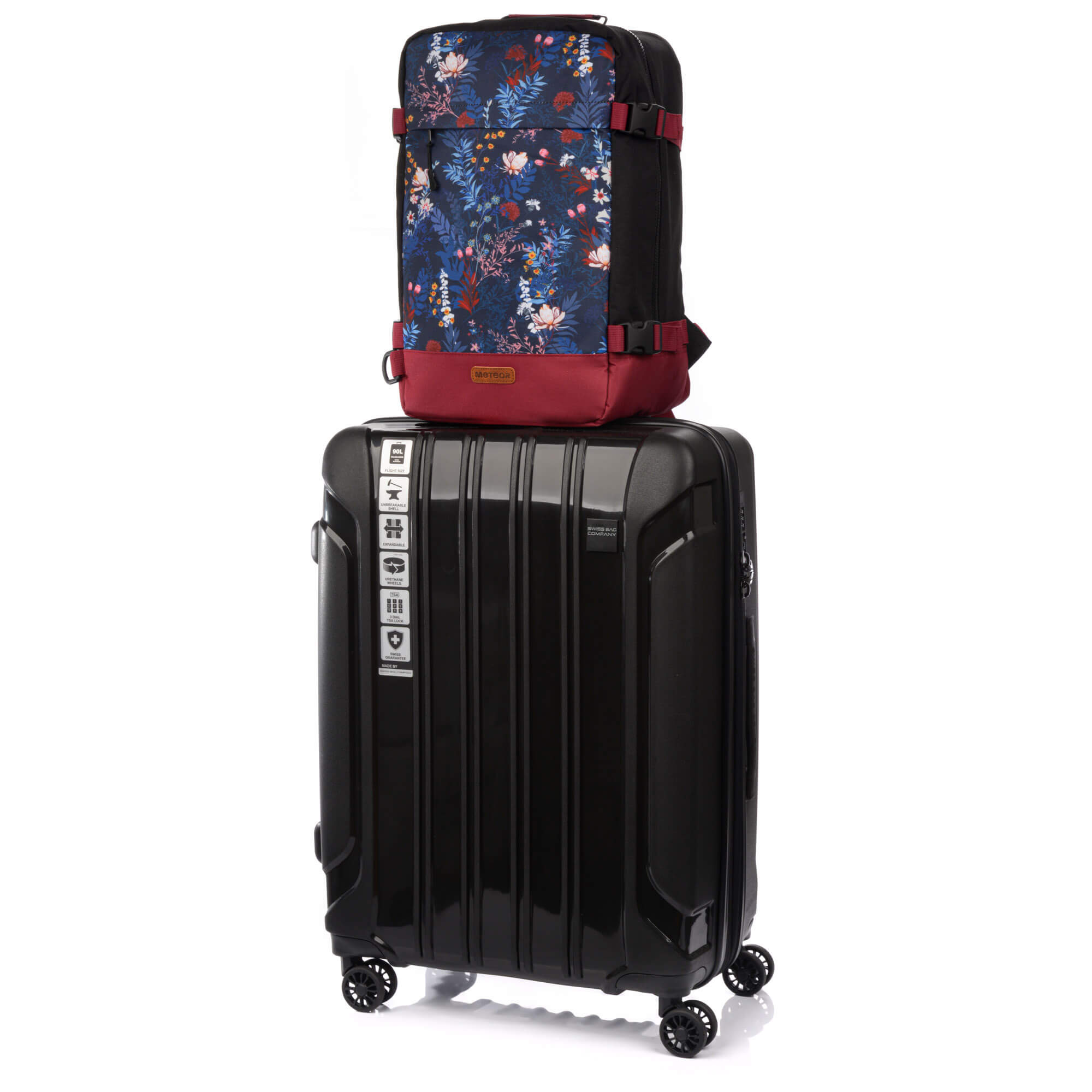 Główna komora oraz trzy mniejsze kieszenie, w tym jedna siateczkowa, oferują przemyślaną organizację przestrzeni dla niezbędnych przedmiotów i drobiazgów. Dodatkowa kieszeń na zewnątrz, zamykana na zamek błyskawiczny, idealnie nadaje się na dokumenty, telefon lub tablet. Specjalnie zaprojektowany uchwyt do mocowania plecaka na rączce walizki ułatwia komfortowe przemieszczanie się z bagażami.