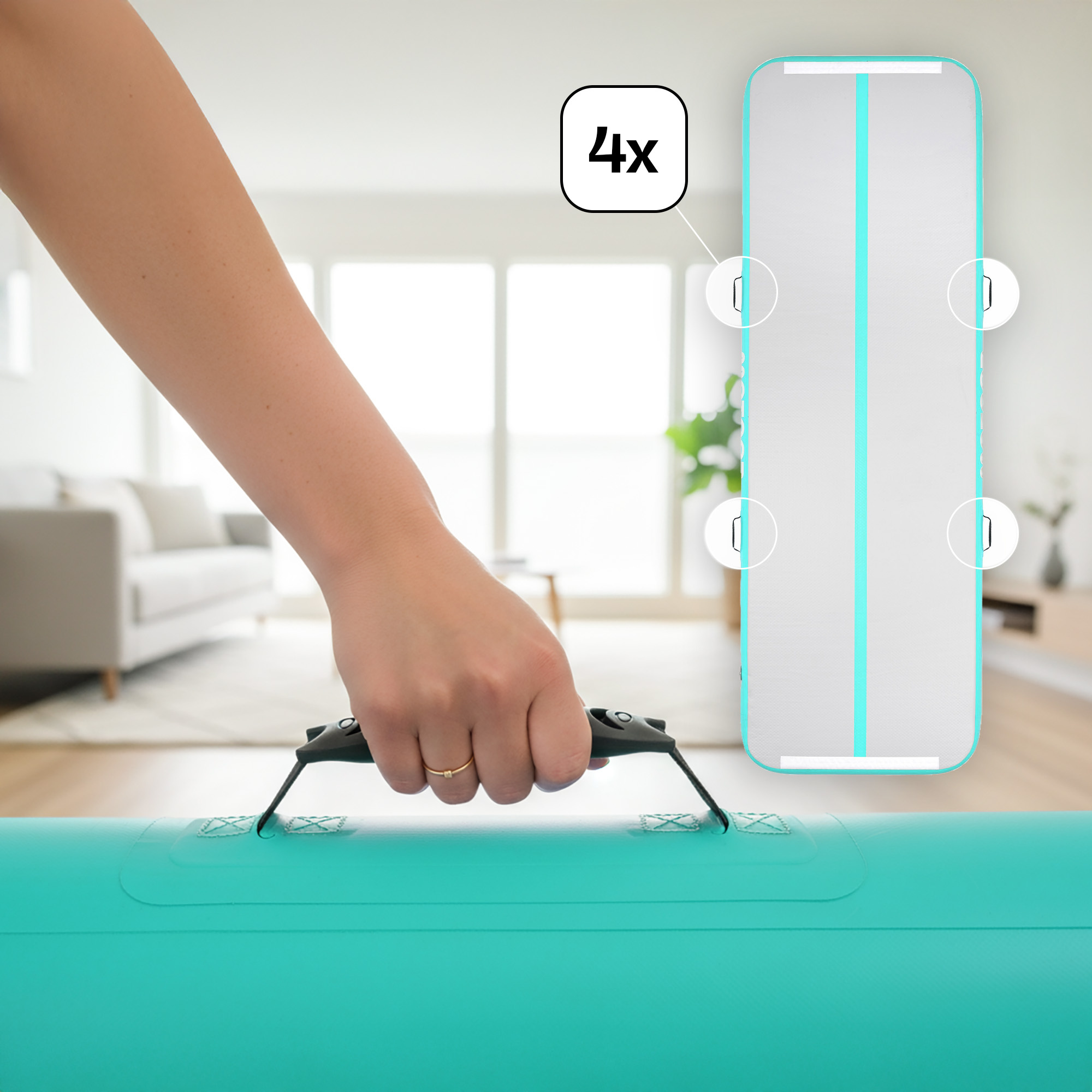 Wysoka jakość – airtrack to bezpieczne podłoże, amortyzujące skoki, salta oraz inne ćwiczenia akrobatyczne. Zastosowanie technologii drop-stitch, czyli dwóch warstw tkaniny PVC łączonych pionowo, zapewnia gęste wypełnienie włóknami wewnątrz maty, sprawiając, że materiał zachowuje swój kształt podczas pompowania i ćwiczeń.